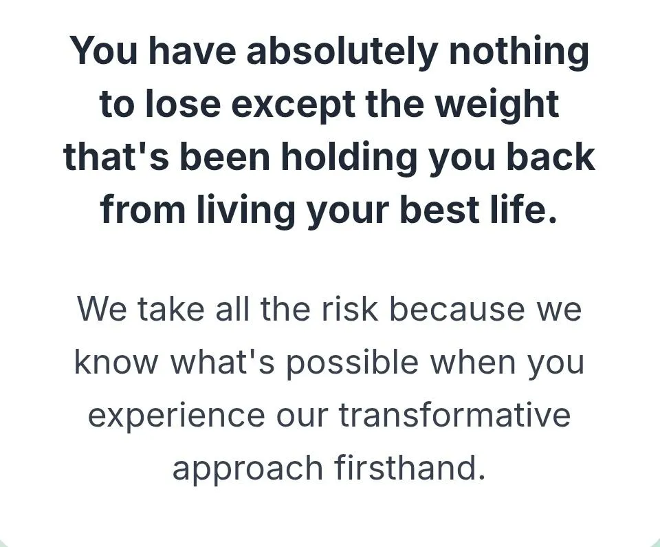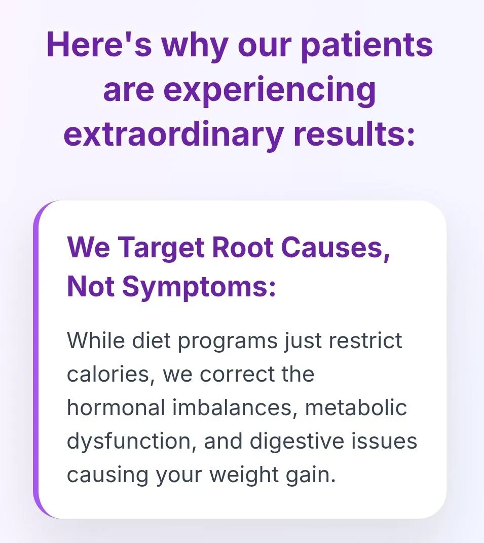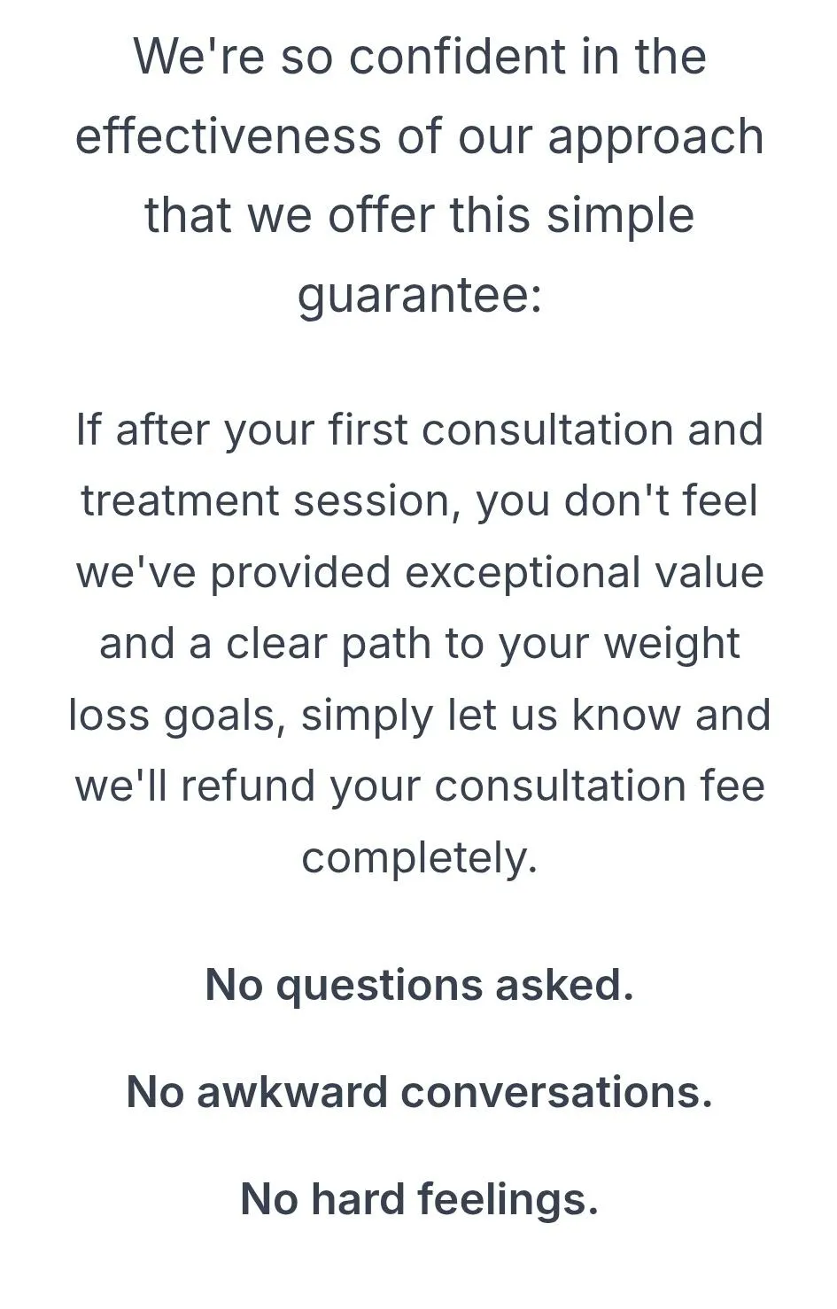 A: There's no catch. We offer this significantly reduced initial consultation for two reasons: First, we know you've likely spent money on weight loss solutions that disappointed you in the past, and we want to remove that barrier to trying a truly effective approach. Second, we're confident that once you experience our unique treatment and see initial results, you'll want to continue your transformation journey with us. Our business grows through successful patient transformations and referrals, not through high-pressure sales tactics.