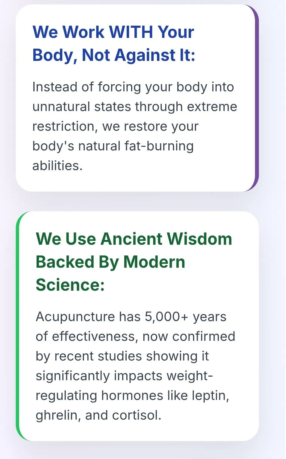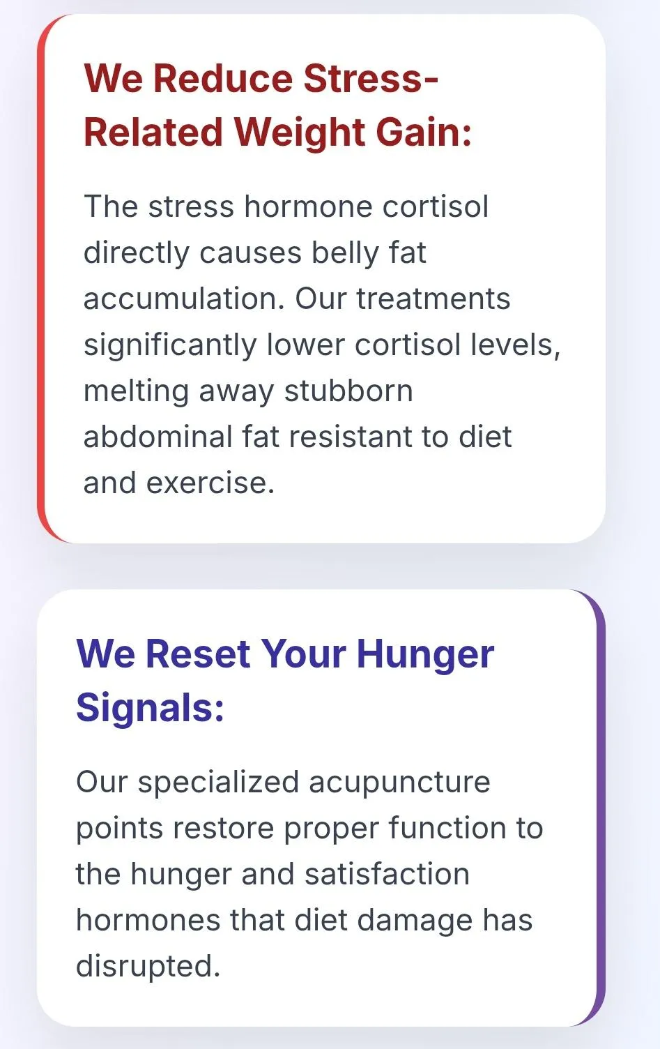 A: Unlike conventional weight loss approaches that treat all bodies the same, our acupuncture system addresses the unique root causes of YOUR weight gain—whether that's hormonal imbalance, metabolic slowdown, stress-induced cortisol production, or digestive inefficiency. By stimulating specific points on your body, we activate your natural healing systems to rebalance hormones that control hunger, fat storage, and metabolism. This is why our patients succeed even after failing with diets and exercise—we're correcting the underlying issues others miss.